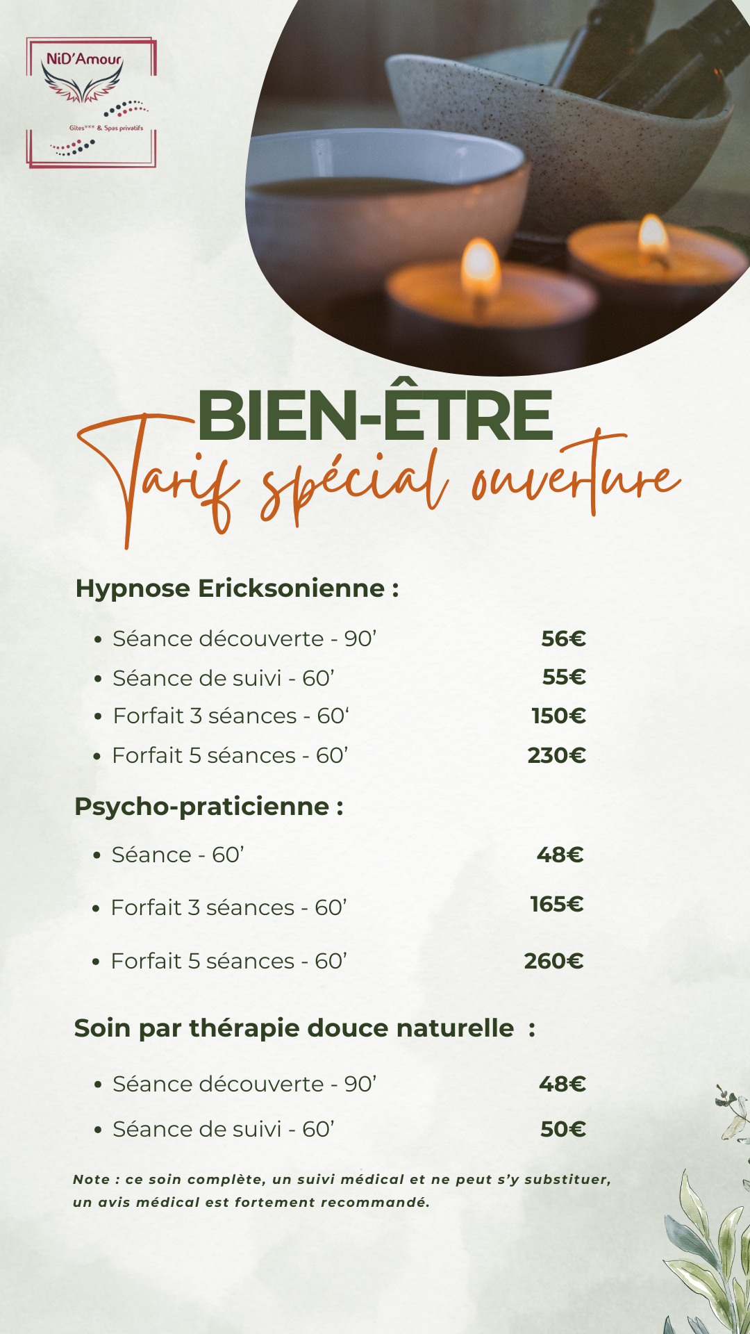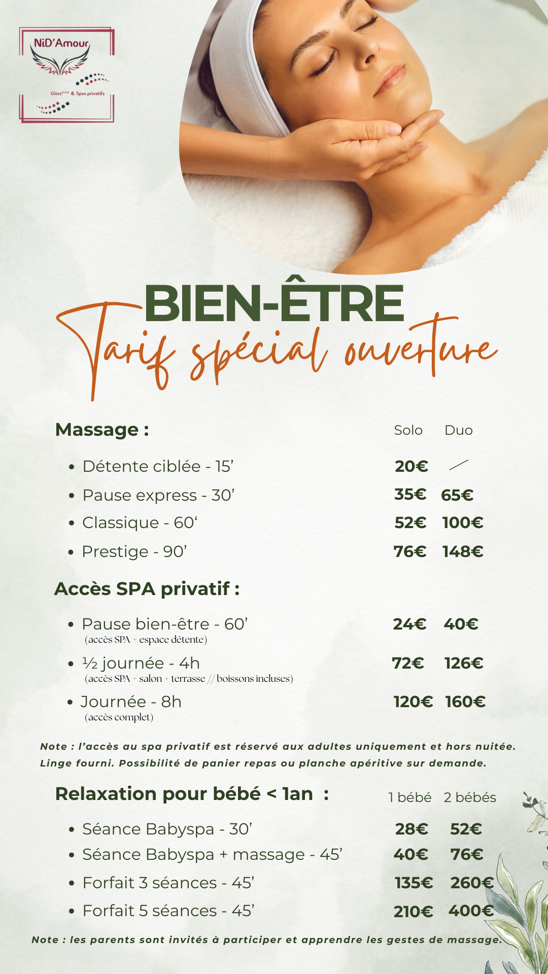 Bienvenue dans l’espace bien-être du Nid’Amour, une nouveauté 2025 pensée pour vous offrir un moment de douceur, de détente et d’accompagnement personnalisé.